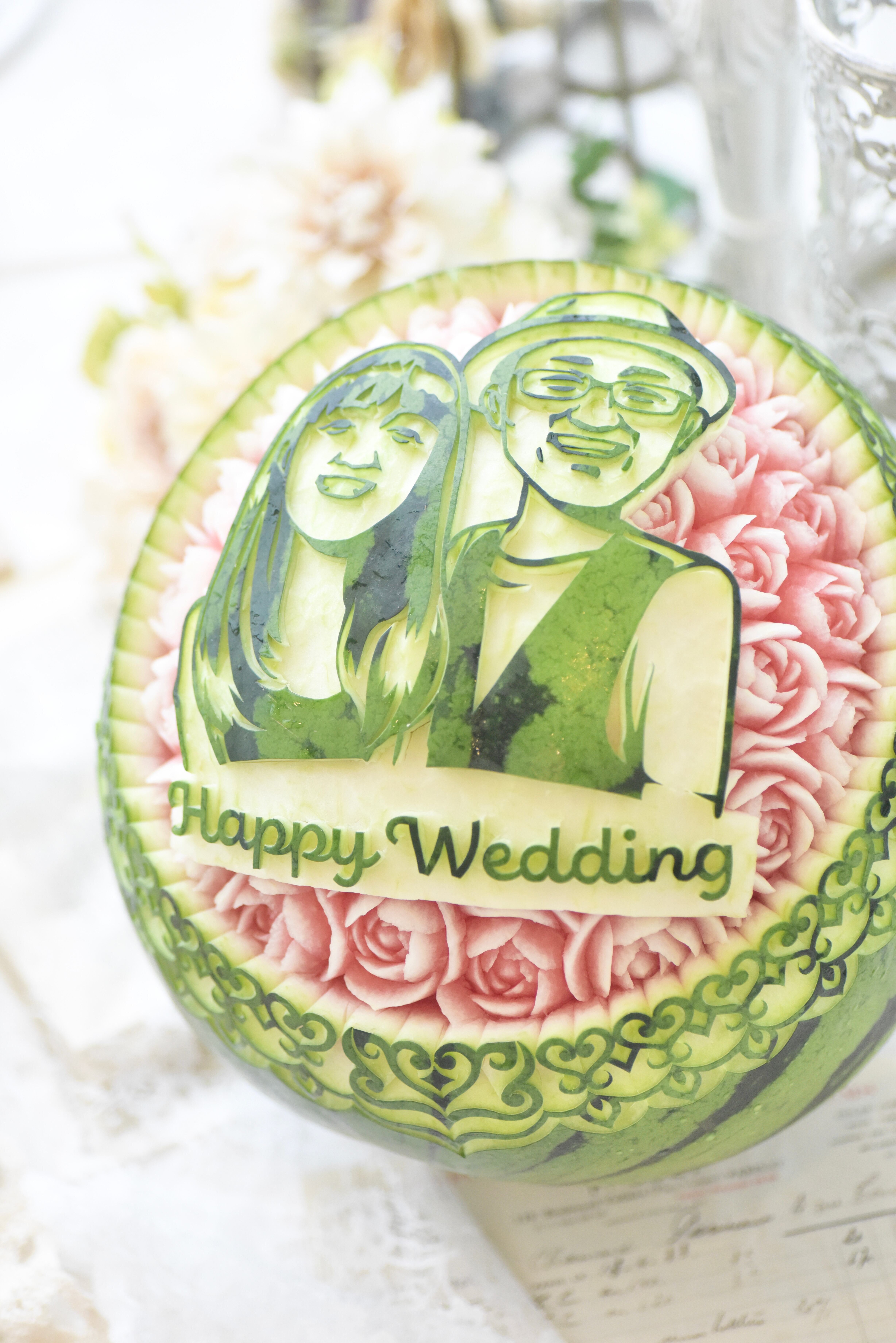 お二人の似顔絵+メッセージ入りお祝いスイカ