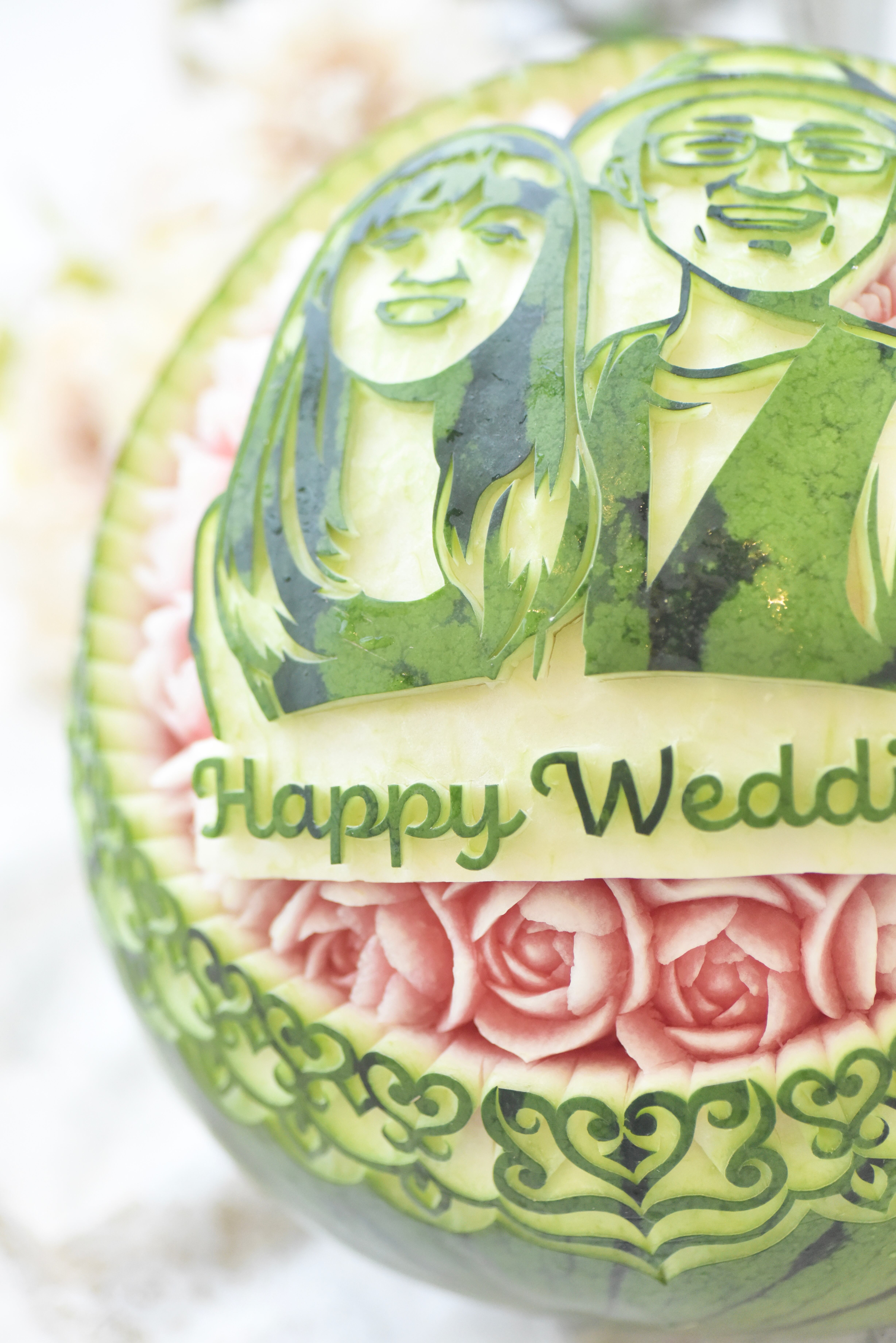 スイカの白皮と果肉部分にはバラを沢山彫り